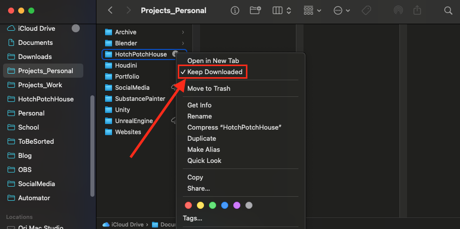Ever since I discovered the “Keep Downloaded” option in iCloud, I had wanted to migrate everything, and now things look much cleaner. Up until now, I had been managing all Unreal Engine projects and 3D assets in local folders, but at last everything is fully cloud managed.