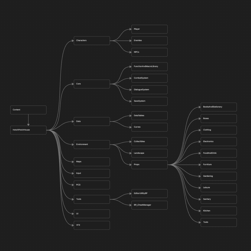 The point that stood out to me the most was the rule of creating a project named folder, in my case “HotchPotchHouse”, directly under the Content folder, and then placing folders like Characters and Maps beneath it.