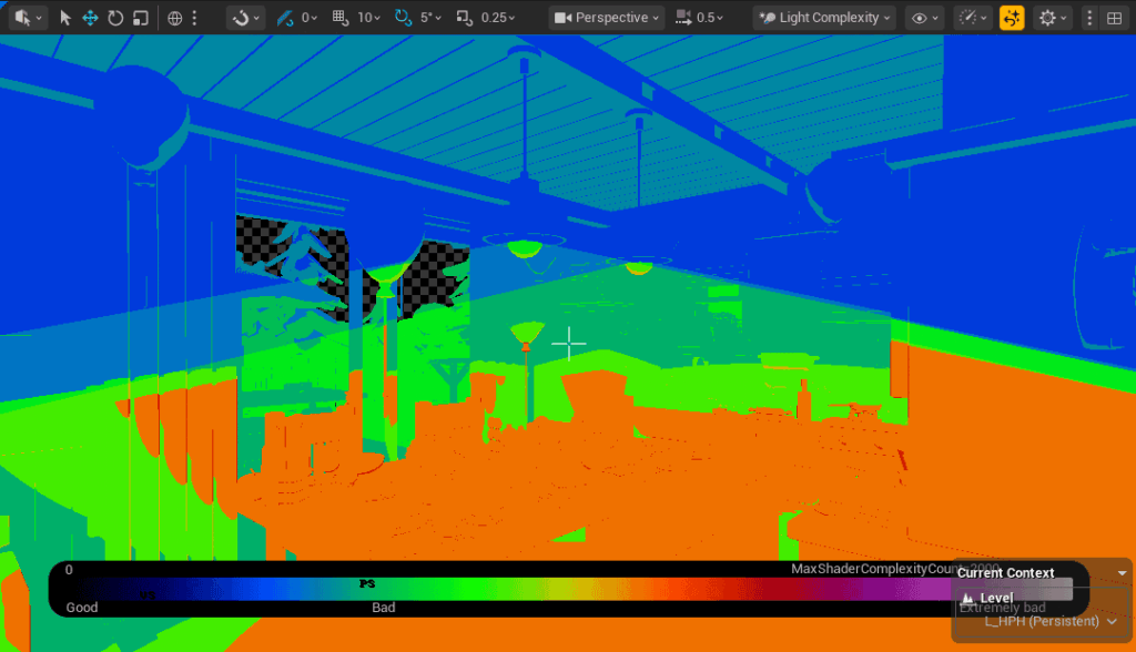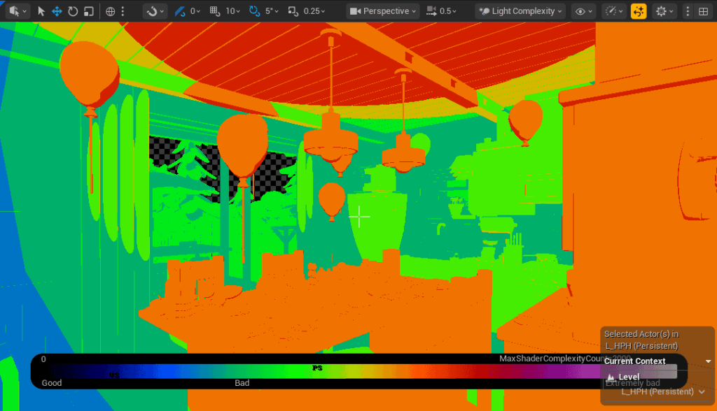First, I enabled View → Optimization Viewmodes → Light Complexity to identify performance heavy areas.
